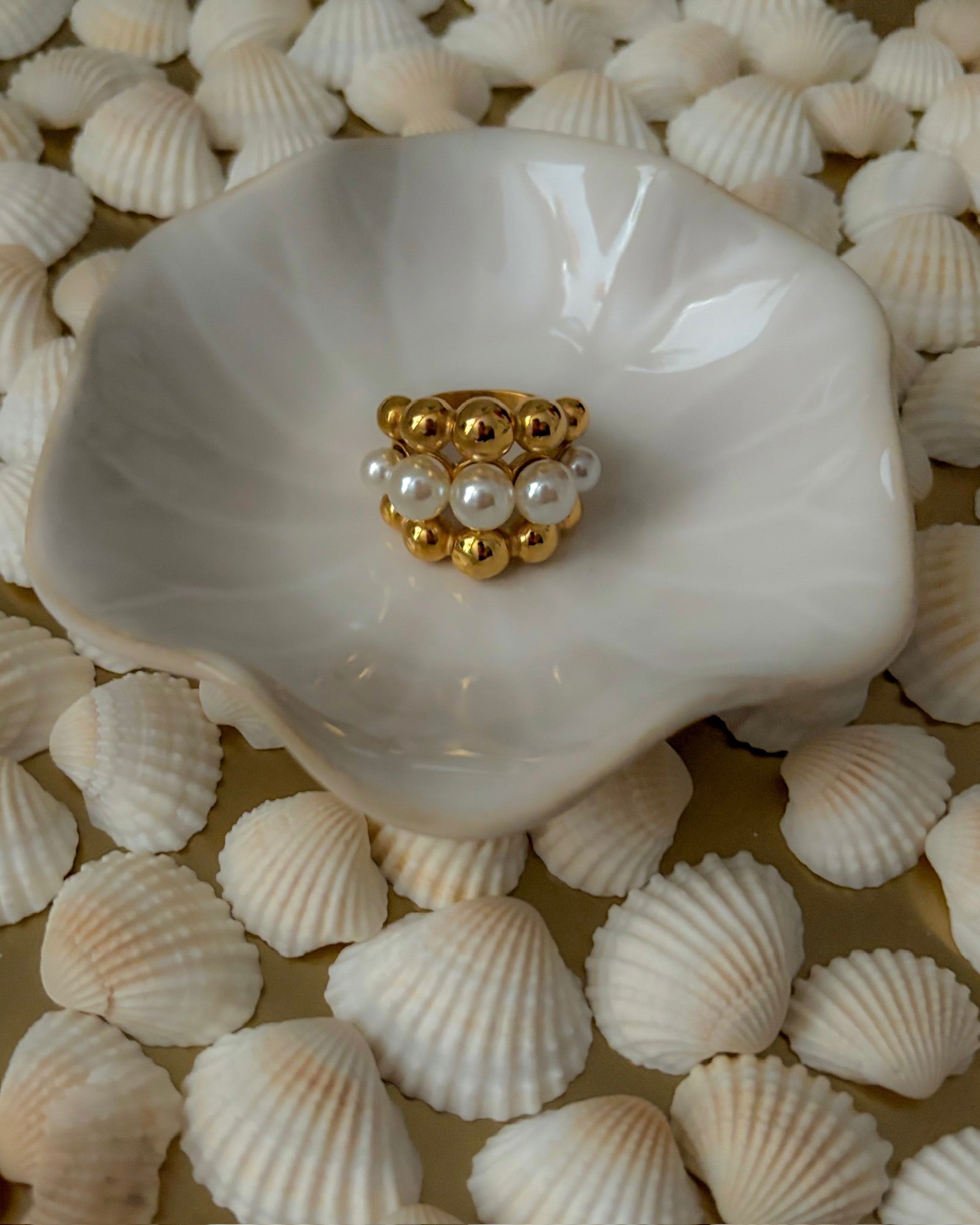 Step into an oasis with this mesmerizing gold and pearl ring!